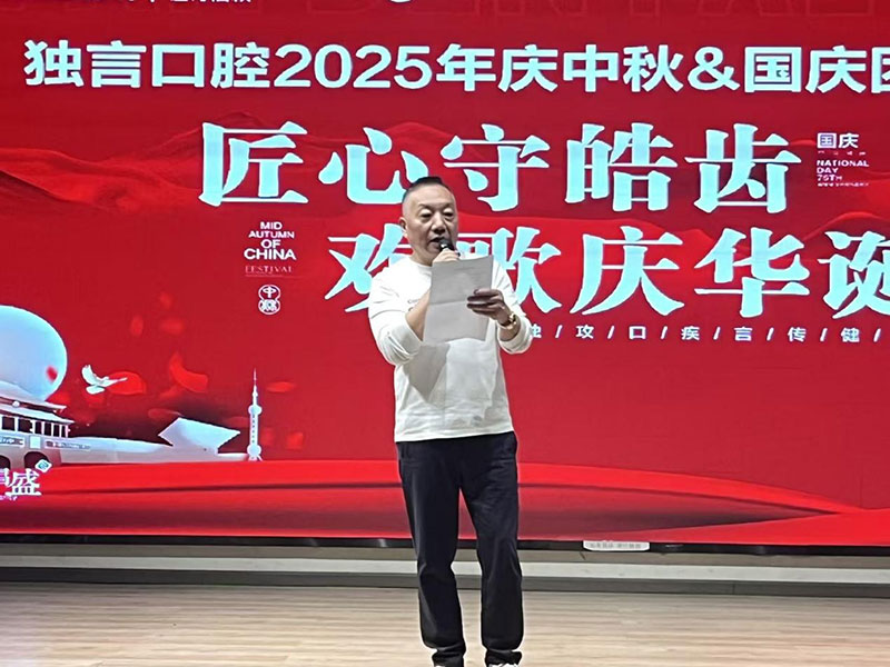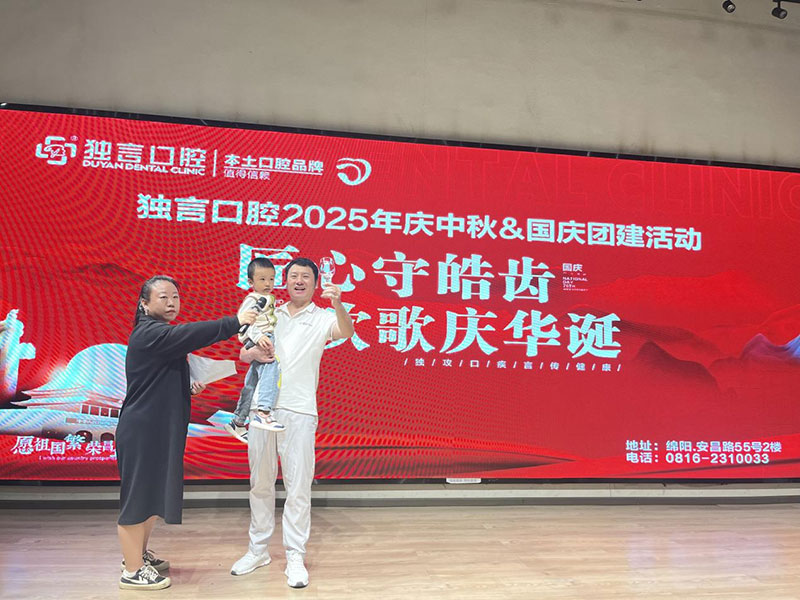 活动尾声,全体员工齐唱《独言口腔院歌》,歌声嘹亮,情感真挚,展现出强烈的团队凝聚力与归属感。随后,《歌唱祖国》的旋律响起,大家齐声高歌,用最真挚的情感向祖国献礼,表达心中炽热的爱国情怀。通过这次活动,大家更加深刻地认识到,独言口腔是一个充满温暖与力量的大家庭,在这个家庭中,每一位成员都是不可或缺的一部分。大家将携手共进,以更加饱满的热情、更加专业的技术,投身于口腔健康事业,为守护市民的口腔健康贡献自己的力量。国庆与中秋双节同至,是家国团圆的美好时刻;独言口腔双节活动,是团队凝聚力量的重要契机。在这个特殊的日子里,独言口腔的全体员工用一场精彩纷呈的活动,展现了团队的团结与活力,表达了对祖国的热爱与祝福。未来,独言口腔将继续秉持匠心精神,以专业的技术、优质的服务,为患者带来更多的健康与幸福,为口腔健康事业的发展做出更大的贡献。让我们携手共进,向着更加美好的未来奋勇前行,用灿烂的笑容,点亮每一座城市,守护每一个家庭的口腔健康。