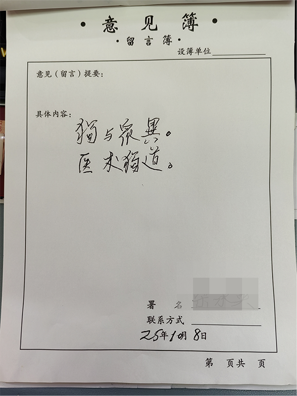 治疗结束后,百岁老伴特意找到意见簿,郑重提笔写下“独与众异,医术独道”八个字。简单的八个字,既是对医生精湛医术的高度肯定,也是对独言口腔20多年来用心服务的最佳褒奖——“独与众异”,是对医院差异化优质服务的认可;“医术独道”,是对医生专业诊疗能力的赞誉。
