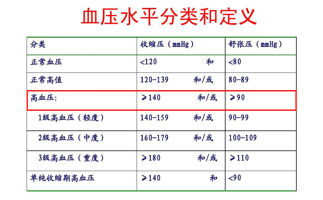 高血压是收缩压≥140mmHg和/或舒张压≥90mmHg。
