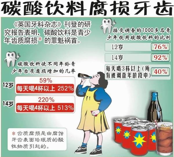 经常摄入高糖食品、饮料或饮用碳酸饮料会导致牙齿脱矿,引发龋病或酸蚀症。提倡减少高糖食品、饮料摄入,少喝碳酸饮料,进食后漱口,晚上睡前刷牙后不再进食。此外,由于完整水果中的糖由一层植物细胞壁包裹,消化过程更缓慢,所以新鲜完整的水果不易致龋,但水果制成果汁后其所含糖分成为游离糖,致龋性就会增加,因此,不建议将水果制作成果汁食用。