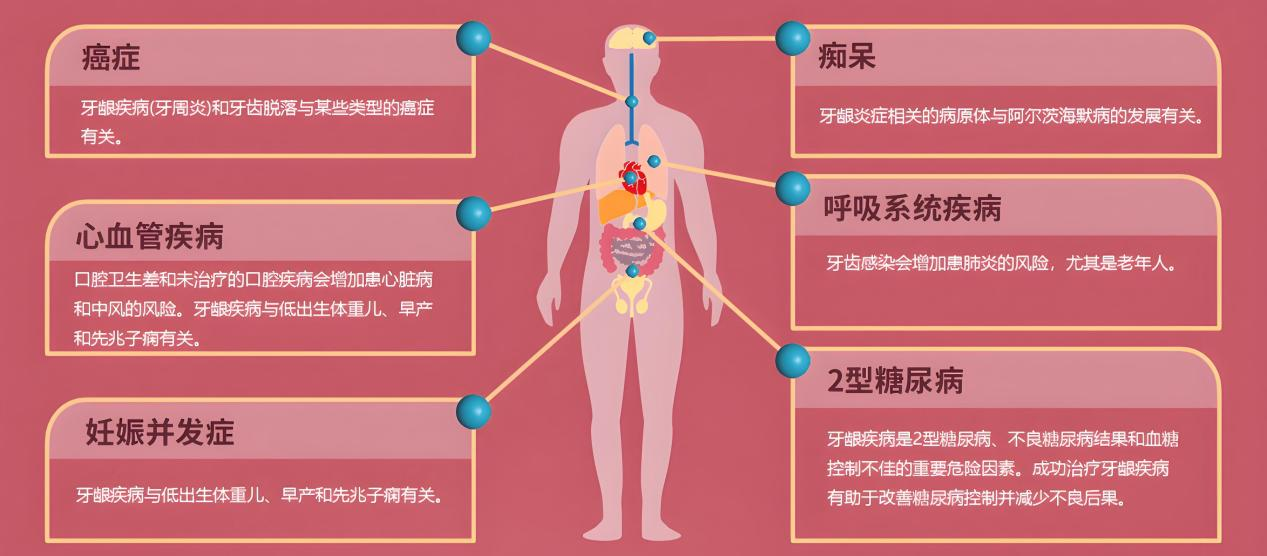 世界卫生组织将口腔健康列为人体健康的十大标准之一。口腔健康的标准是“牙齿清洁、无龋洞、无疼痛感、牙龈颜色正常、无出血现象”。口腔疾病与全身各个器官的健康相互关联,口腔疾病作为引起或者加重系统性疾病的共同危险因素。根据相关研究,口腔疾病至少在以下几个方面和全身健康存在关系: