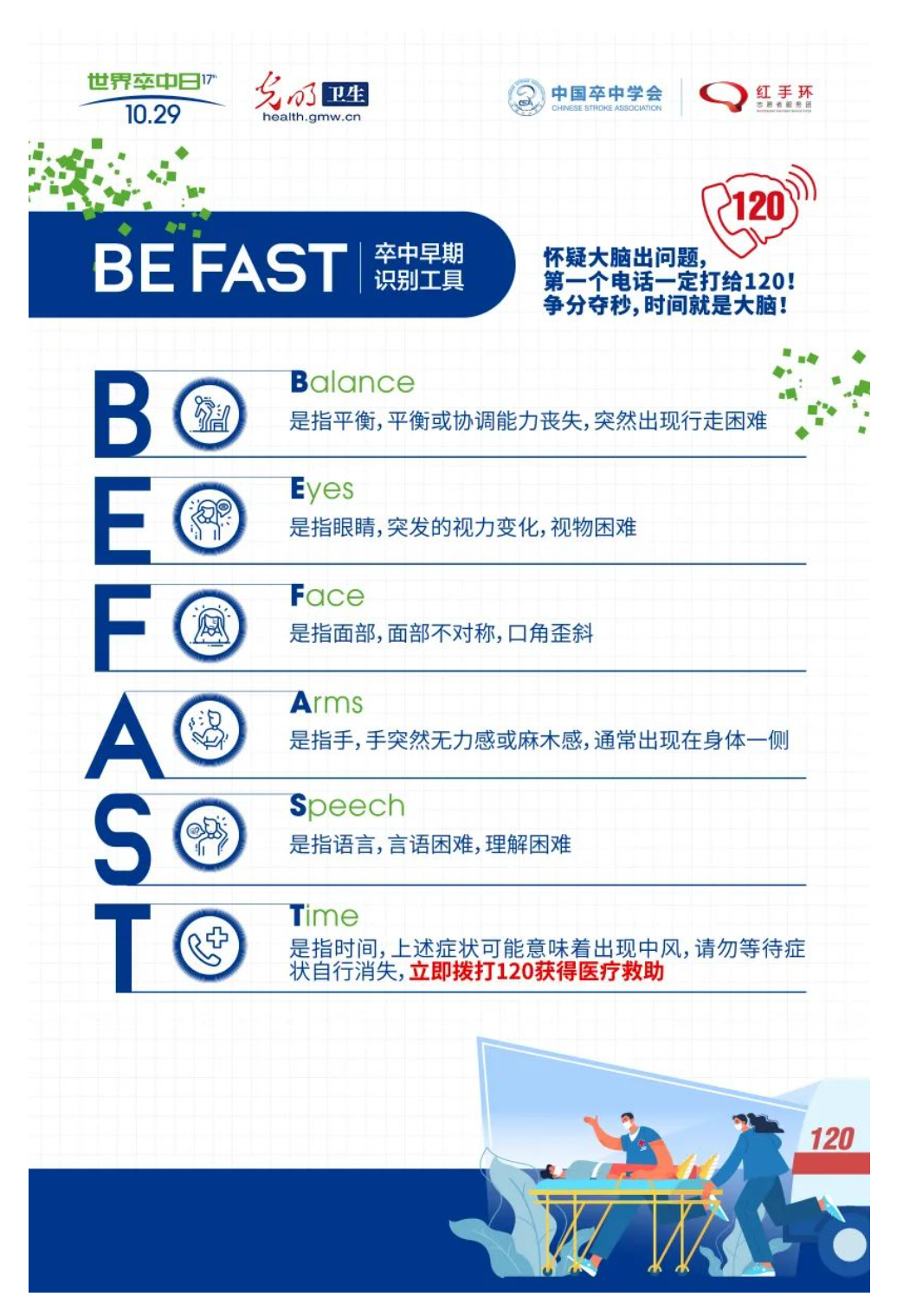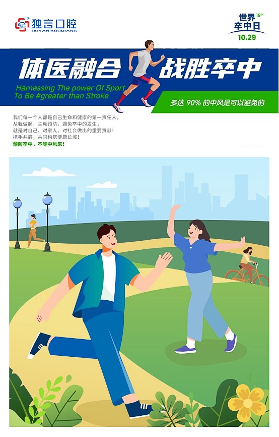 今年的宣传主题为“体医融合,战胜卒中”。倡导大众积极了解预防卒中的科普知识,树立“运动是良医”“每个人都是自己健康的第一责任人”健康理念。通过科学运动、践行健康生活方式预防卒中发生,推进卒中早期预防、诊治和促进患者康复。